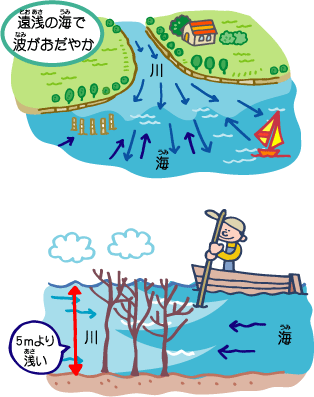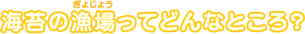 海苔が育(そだ)つ漁場(ぎょじょう)の条件(じょうけん)はいくつかある。まず、おだやかで遠浅(とおあさ)な海(うみ)であること。次(つぎ)に、潮(しお)の流(なが)れによって、適度(てきど)な水の交換(こうかん)ができること。そして、海苔が育つのに必要(ひつよう)な栄養塩(えいようえん)が川(かわ)から運(はこ)ばれること。海苔の養殖(ようしょく)が始(はじ)まった江戸時代(えどじだい)から、このような条件(じょうけん)を満(み)たす漁場(ぎょじょう)を見(み)つけて、海苔の生産地(せいさんち)が少(すこ)しずつ拡大(かくだい)していったんだ。